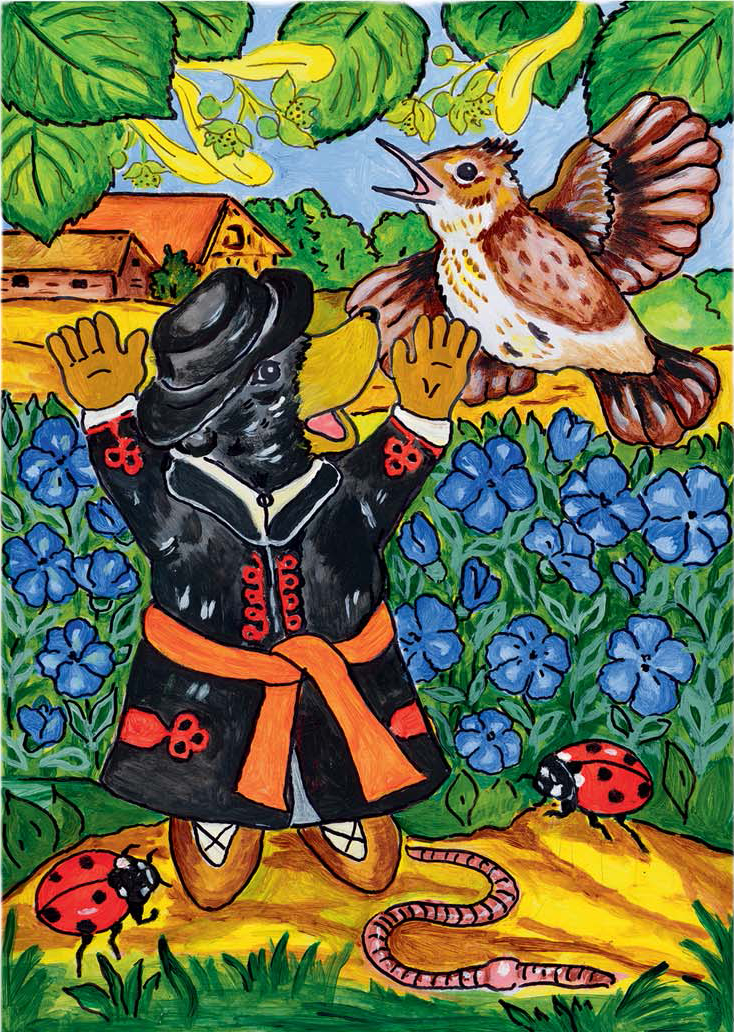Mütäs Mati tulli maa alt vällä. Temä ihen olli nelläkandiline põllulapp. Nurm olli täis ilusit sinitsit äitsmit. „Küll om iluse lilli!“ ütel Mati.