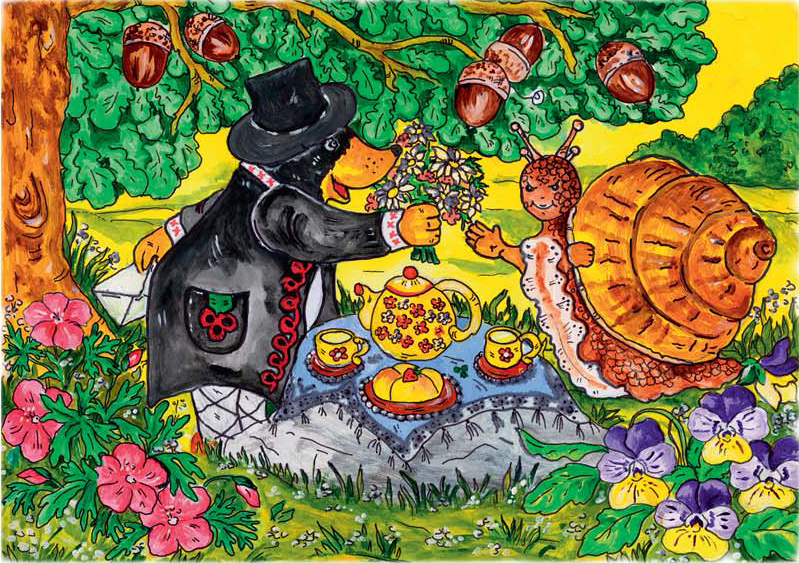 Puulbe panni mütäs Mati endel musta mulgi kuvve selgä ja kaapkübäre pähä. Pidurõõvin läits ta tigu Tiiu manu. Tigu olli tamme ala kivi pääle lavva sääden. Kivi pääl ollive lilliline tiikann ja kuldise tiitassi. Kannu sihen olli lämmi tiivesi. Tiiu olli esi kütseten iluse munakoogi kah.